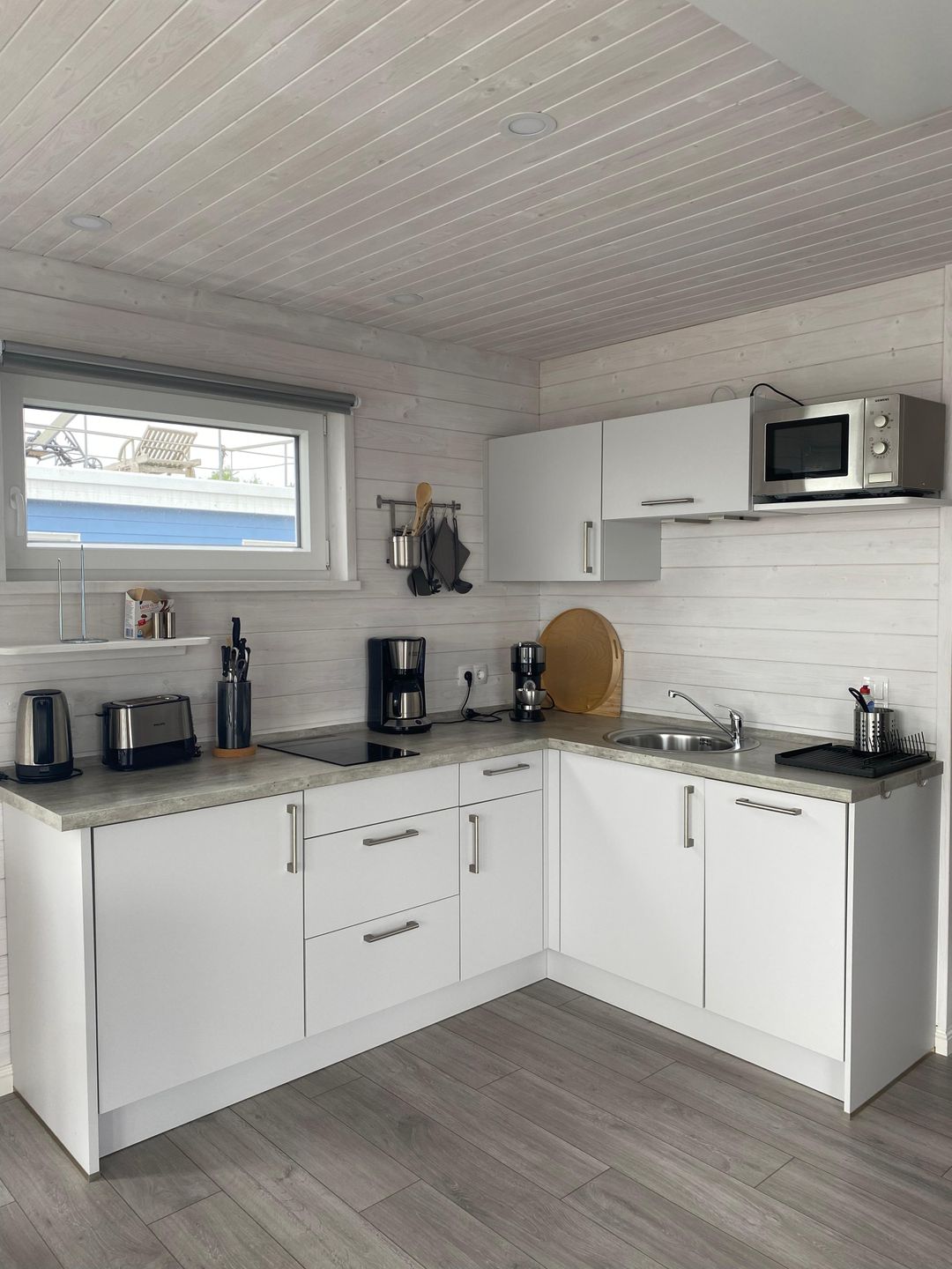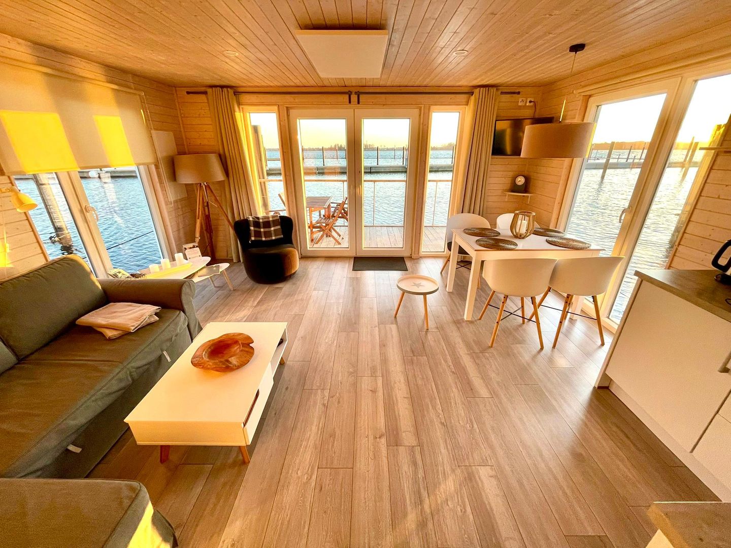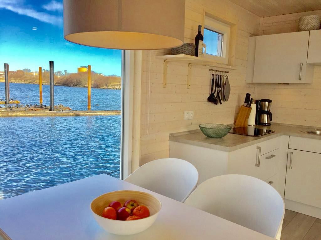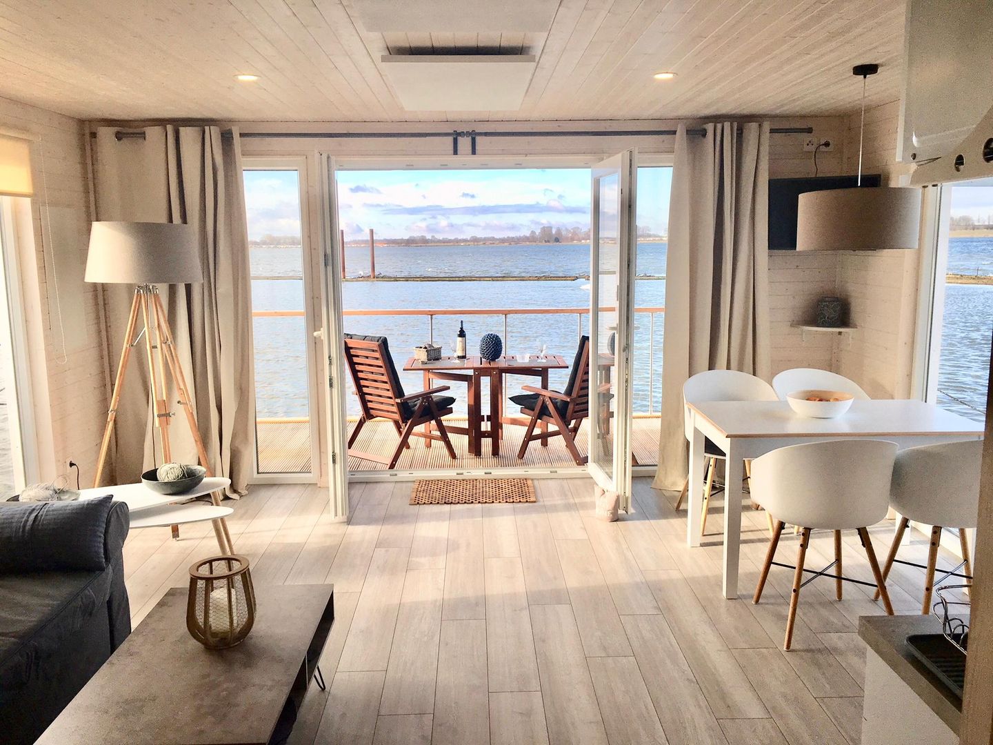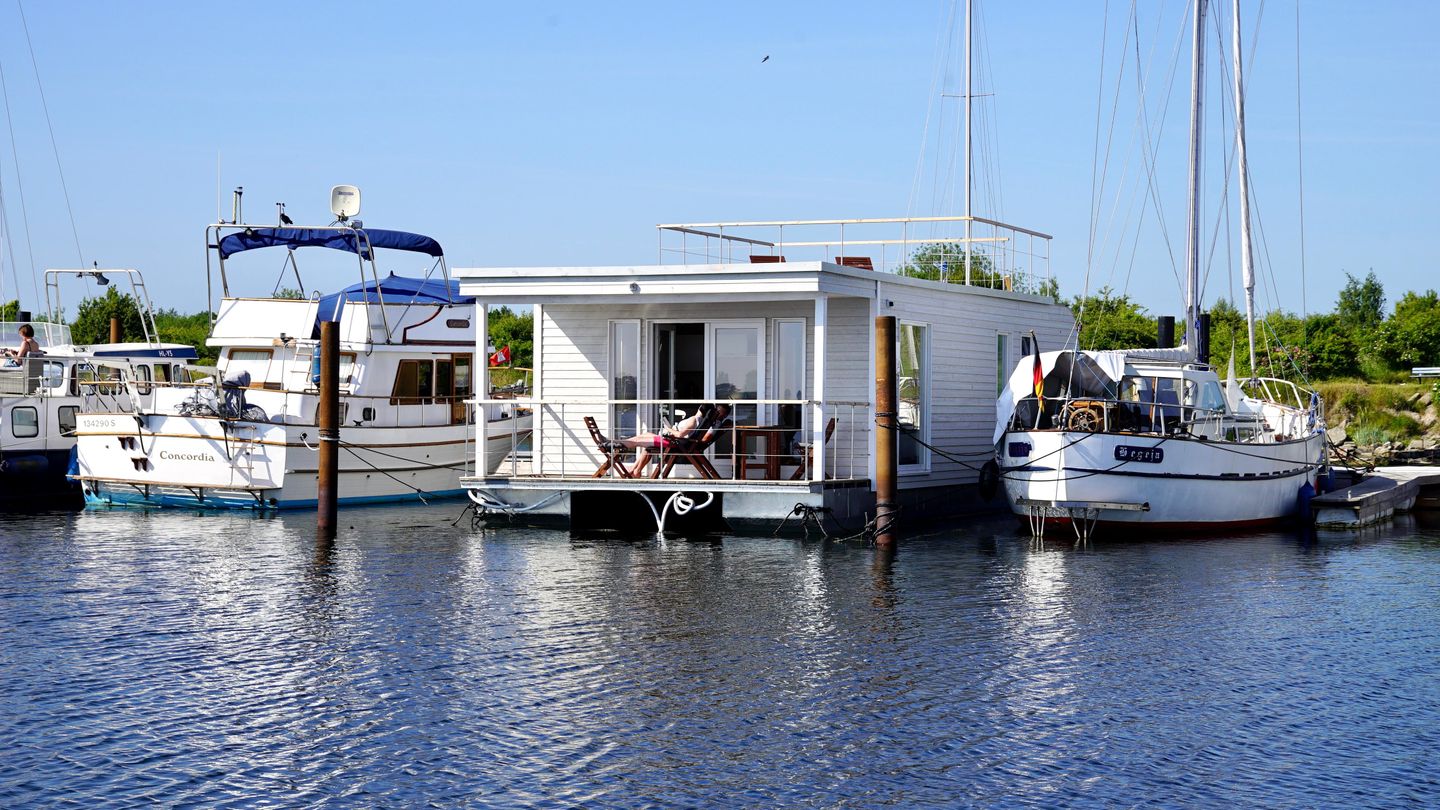 Zwei Terrassen und eine großzügige Dachterrasse laden zum Entspannen ein, während große Fensterfronten für ein helles, freundliches Ambiente sorgen. WLAN, TV und weitere Annehmlichkeiten stehen selbstverständlich zur Verfügung – perfekt für eine erholsame Auszeit auf dem Wasser.